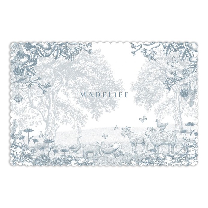 Heel bijzonder geboortekaartje met ècht schulprandje. Geboortekaartje boerderij dieren met een schaap, geit, kip en lammetje. De illustratie is in prachtige monotonen verkrijgbaar, blauw, roze en groen. Prachtig gender neutraal geboortekaartje voor wie van het platteland houdt! Kijk eens in de beeldbank onder 'omkleurbare elementen' voor meer mogelijkheden in folie.