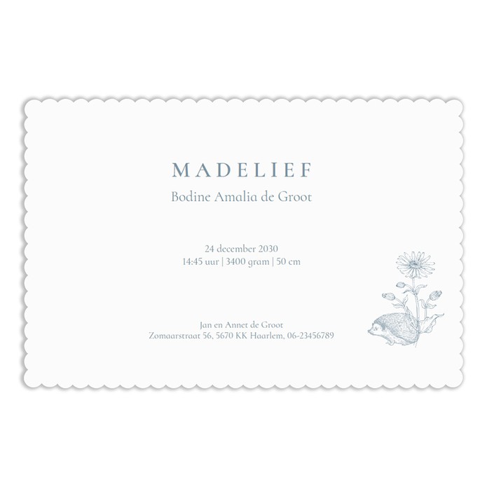 Een uniek geboortekaartje met schulprandje! Dat is weer eens wat anders dan vierkant of rechthoek. De kaart past perfect in een envelop horende bij kaartformaat 15x10cm.