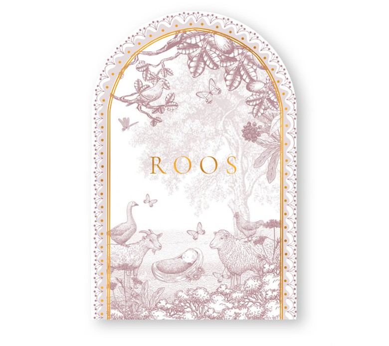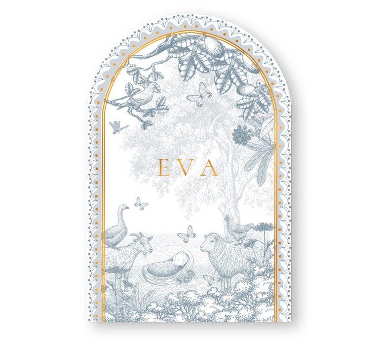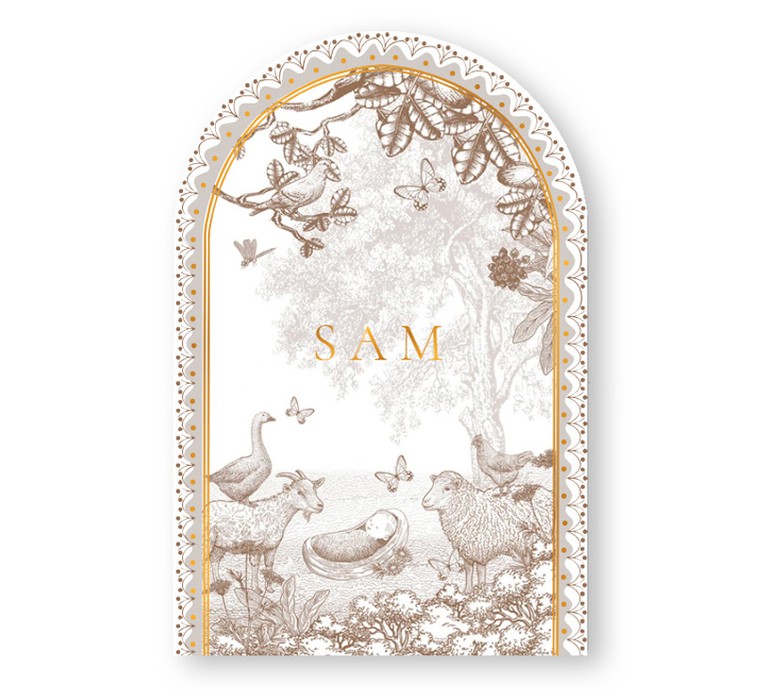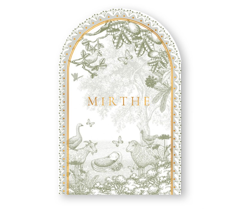 Geboortekaartje sereen maar wel met een prachtige illustratie en in bijzondere vorm. De boogvorm met illustratief kader prachtig met de monotoon afbeelding van boerderij leven met schaap en geit en kindje in een mandje.