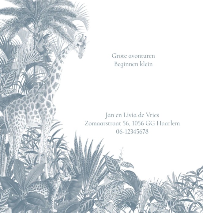 Geboortekaartje jungle in blauwe tint met giraffe, zebra en olifant. Een klassieke, neutrale en rustige geboortekaart maar ook illustratief. Ingetogen geboortekaartje in het blauw met dieren en planten.