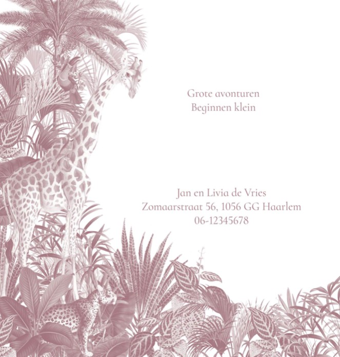 Geboortekaartje jungle in roze tint met giraffe, zebra en olifant. Een klassieke, neutrale en rustige geboortekaart maar ook illustratief. Ingetogen geboortekaartje in het roze met dieren en planten.