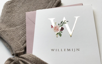 We hebben een zeer uitgebreide collectie aquarel bloemen in de beeldbank staan. Boeketten, kransen, letters, cijfers, lossen bloemen en takken. Dus waar wij gestopt zijn kun jij jouw geboortekaartje nog verder aanvullen met aquarel bloemen in dezelfde stijl. Vervangen voor andere bloemen behoort ook tot de mogelijkheden, jij bent jouw eigen designer. In het voorbeeld zie je een letter van het alfabet. We hebben alle letters voorradig, mail ons even dan zet ik hem zo netjes mogelijk voor jullie in het kaartje.