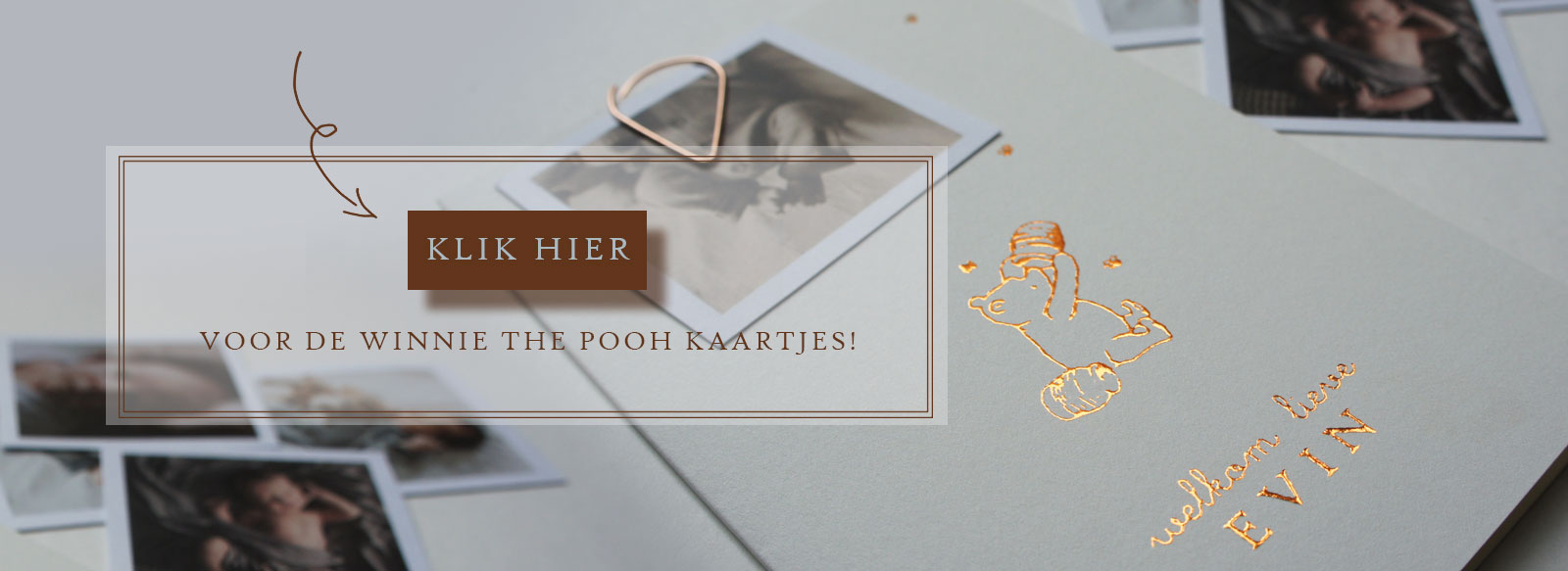 Klassieke opbouw van de kaartjes hebben onze voorkeur, net als de boekjes van vroeger. De namen in kapitalen en het papier doet de rest. Aan de voorkant of binnenkant kun je één van de beroemde zinnetjes van Pooh vermelden. Zinnetjes uit de boekjes geschreven door A.A. Milne.